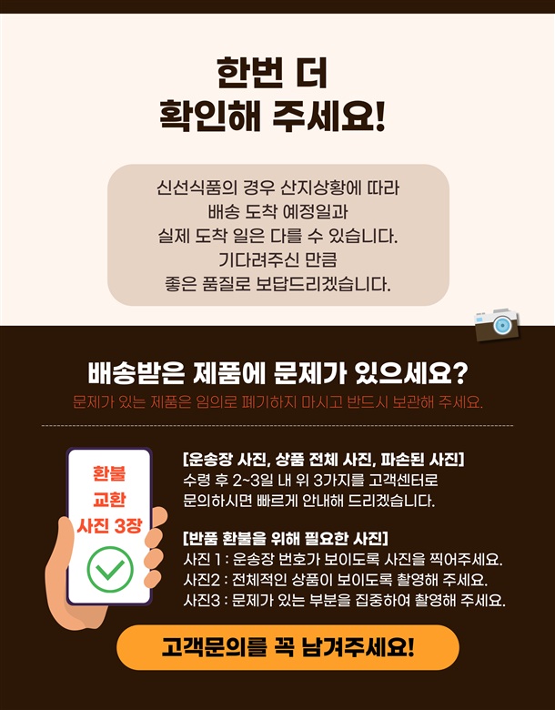 · 상품 불량 사유와 사진을 남겨 주시면 빠른 처리가 가능합니다.