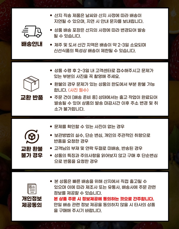 - 개인정보는 배송 완료 후 파기되며, 주문자는 이에 동의한 것으로 간주됩니다.